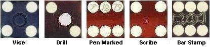 Used dice may be bought as souvenirs from many casinos although some refuse to let them go. When a die is taken out of play it will be cancelled. It could be that a hole is drilled through it or a crescent or circle is pressed into one side with a vice. Sometimes a gold bar is hot stamped on the six-spot. A sharp pointed metal scribe is often used to press a small shallow mark into a face. Some older dice were scratched or had a date or initials marked on them. By state law Atlantic City casinos must drill all the way through their used dice. If you want true perfect dice then pay the extra for a stick. A stick is a number of dice that are still in their sealed pack as delivered by the manufacturer.