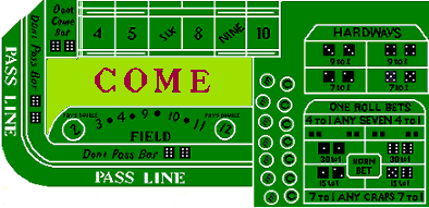 These bets are set in the middle of the Craps table layout and you place these bets through the dealer. These are just about the worst bets you can make in a game and should be avoided.Hardways Hardway bets are located in the centre of the craps table and are placed by the dealer. Hardways may be bet any time. The four possible Hardway bets are "Hardway Six" (two 3's) and "Hardway Eight" (two 4's), which pay 9 to 1, and "Hardway Four" (two 2's) and "Hardway Ten" (two 5's) - which pay 7 to 1. You win if the Hardway your betting rolls before a 7. The bet loses if you roll a 7 first or if the number rolls with a non-pair combination. For example a "Hardway Eight" wins only if two 4's are thrown before a 7 or before an "easy-way" eight (5-3 or 6-2 combination) . Hardways are off and not working on the come out roll unless the player designates the bet to be on. One Roll Bets The following bets can be made on any roll of the dice. The bets win or lose each roll depending upon the result of the throw. These bets are handed to the Dealer to be placed in the appropriate part of the craps table. Winning bets are automatically placed again for the next roll unless specifically called off by the player. J) Any 7: If 7 rolls you win and are paid 4 to 1. All other numbers lose. K) Any Craps: If 2,3 or 12 rolls you win and are paid 7 to 1. All other numbers lose. L) Two Craps or Aces: If 2 is rolled, you win and are paid 7 to 1. All other numbers lose. M) Twelve Craps or Two Sixes: If 12 is rolled, you win and are paid 30 to 1. All other numbers lose. N) Three Craps or Ace-Deuce: If 3 rolls you win and are paid 15 to 1. All other numbers lose. O) Eleven or Six-Five: If 11 rolls you win and are paid 15 to 1. All other numbers lose. P) Horn Bet: Is a four unit (or multiple thereof) bet whereby you are betting one-fourth of your wager on 2, 3, 11, and 12. If 3 or 11 rolls you win and are paid 3.75 to 1. If 2 or 12 rolls you win and are paid 7.5 to 1. If a number other than 2, 3, 11, or 12 rolls, you lose. Horn High Bets: Same as a Horn Bet except you are betting an extra unit straight up on either 2, 3, 11 or 12 as you so designate. For example: a $5.00 Horn High Aces has one dollar each on 3, 11, and 12 and $2.00 on Aces. If one of these four numbers rolls, you win, and the payoff is calculated in the same manner as a "Horn Bet". If any other number rolls you lose. For tables of odds, showing the true odds, payoffs, and House edge, try Craps Odds