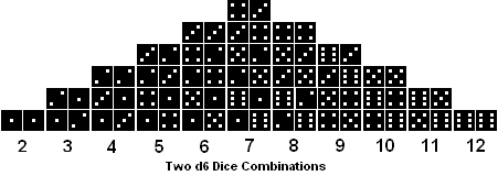 There are 36 possible outcomes of two dice. The following tables show the true odds for the specified outcome of the dice. (A) This column gives the number of possible ways of making the dice total. (B) This column gives the odds against making the dice total in a single roll. (C) This column gives the odds against rolling the dice total before a 7. (D) These columns give the odds against making the higher dice total before the lower dice total. e.g. 12 before 6 = 5 - 1. For making the lower number before the higher, reverse the odds. e.g. 6 before 12 = 1 - 5.