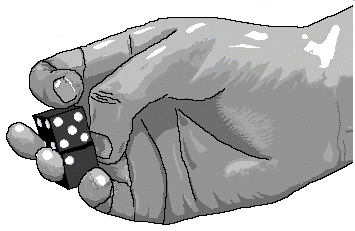Control Cackle is the term used for a false shake or rattle of the dice in the hand, when in fact they are being held in a special finger grip. The Lock Grip is about the first move a cheat learns. The idea is to hold and shake two dice convincingly without them turning in the cheat's hand. Study the diagram and see how they are held. The two dice rest in the bend of the two middle fingers. The forefinger and the smallest finger stop them rolling back and forth, while the thumb stops them turning along the other axis. The sound of the rattle produced is known as cackle. The knuckles of the two middle fingers may look a bit awkward because they are protruding, but this can be hard to spot when the hand is in motion. Try and detect this move by watching how the cheat picks up the dice.